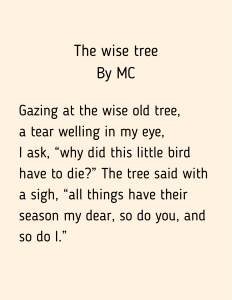 “The wise tree” poem is about the circle of life and how humans go through it along with flora and fauna.